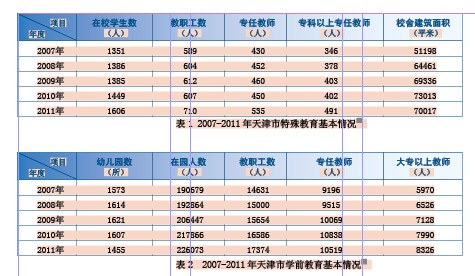 表1的数据可以算出,2011年与2007年相比,在校学生数增长了18.9%,教职工数增长了20.5%,专任教师增长了24.4%,专科以上专任教师增长了41.9%,校舍建筑面积增长了36.8%,天津市特殊教育的情况有了全方面的快速发展。
