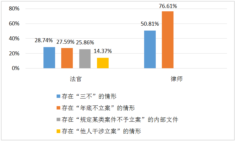 根据现行《中华人民共和国民事诉讼法》(以下简称“民诉法”)的规定,对于符合起诉条件的立案申请,法院必须受理。但在司法实践中,有案不立、人为控制立案、年底不立案等现象仍然存在。法院通过选择性立案的方式,将不宜、不能、不愿意处理的纠纷通过立案环节阻挡在诉讼程序之外。调研数据显示,50.81%的律师在最近一年内遇到过法院“不收材料、不予答复、不出具法律文书”的情况,且有76.61%的律师反映法院存在年底不立案的现象。对此,71.26%的法官表示其所在法院并不存在“不收材料、不予答复、不出具法律文书”的情况,且仅有27.59%的法官表示其所在法院会年底不立案。此外,25.86%的法官表示其所在法院存在规定某类案件不予立案的内部文件,14.37%的法官反映存在法院内部人员、其他机关、团体或个人干涉立案的情况。在法院是否会选择性立案的问题上,律师数据和法官数据存在较大差异,其中部分原因在于问卷提问方式的不同——律师以提问个人为主,法官则要求以法院为基础作答。但不可否认的是,符合起诉条件的民事纠纷被排除在立案程序之外的情形确有发生。并且,这种人为影响立案的行为实际上是对当事人诉权的变相否定,是造成“立案难”的重要原因。