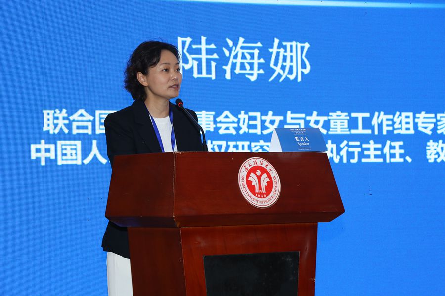 联合国人权理事会妇女与女童工作组专家,中国人民大学人权研究中心执行主任、教授陆海娜作题为《数字如何赋能妇女》的主旨发言。图片来源:西南政法大学人权研究院