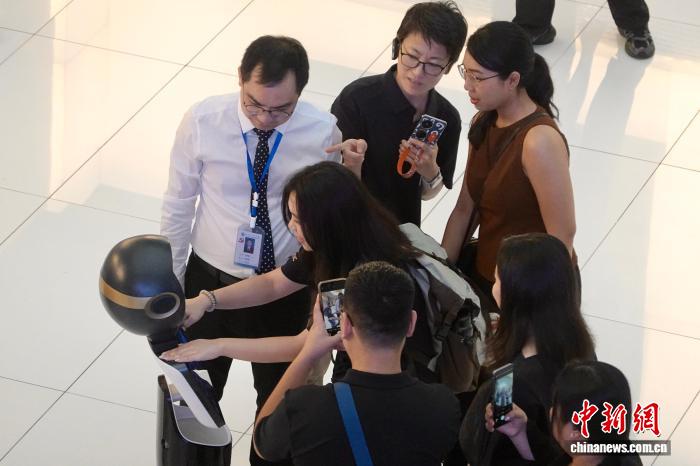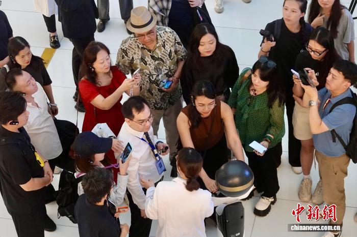 9月24日,来自马来西亚、印度尼西亚、老挝、越南、缅甸以及中国的专家学者、媒体人走进位于浙江的杭州市中医院,体验中医文化和智慧医疗服务。图为中外嘉宾了解中医四诊体质辨识机器人。中新社记者 刘子琳 摄