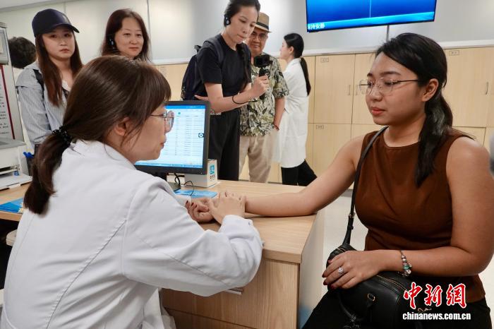 9月24日,来自马来西亚、印度尼西亚、老挝、越南、缅甸以及中国的专家学者、媒体人走进位于浙江的杭州市中医院,体验中医文化和智慧医疗服务。外籍嘉宾体验把脉。中新社记者 刘子琳 摄