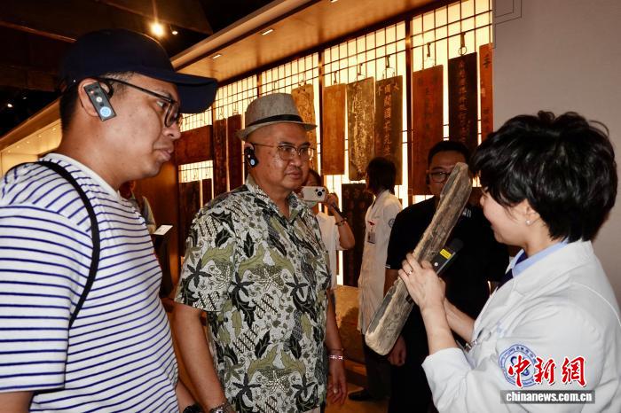9月24日,来自马来西亚、印度尼西亚、老挝、越南、缅甸以及中国的专家学者、媒体人走进位于浙江的杭州市中医院,体验中医文化和智慧医疗服务。工作人员向外籍嘉宾介绍中医药牌匾的历史。中新社记者 刘子琳 摄
