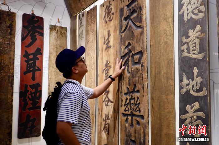 9月24日,来自马来西亚、印度尼西亚、老挝、越南、缅甸以及中国的专家学者、媒体人走进位于浙江的杭州市中医院,体验中医文化和智慧医疗服务。外籍嘉宾感受中医药牌匾的纹路。中新社记者 刘子琳 摄