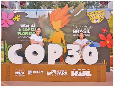 游客在巴西贝伦的COP30主题装饰物旁拍照。本报记者 时元皓摄