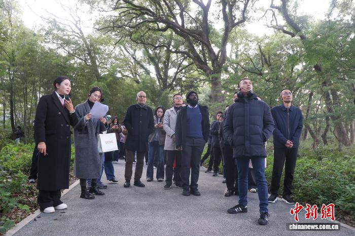 图为中外嘉宾在流坑古村外的千年古樟树林参观,了解生态环境保护情况。中新社记者 刘力鑫 摄