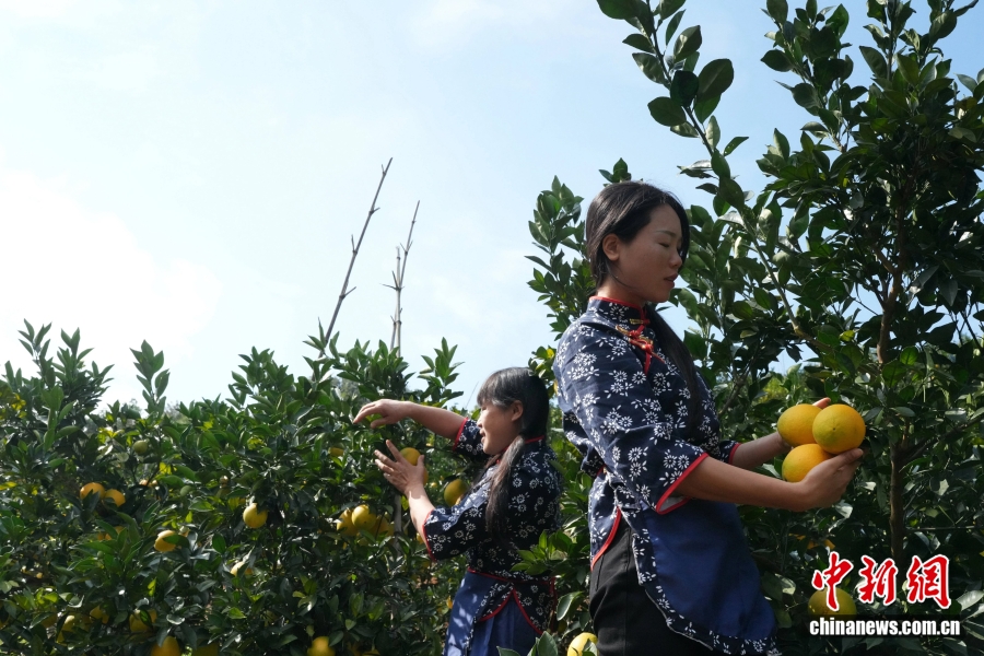 2025年11月1日,江西上犹县“犹江红”脐橙示范基地里,金黄的果实压弯枝头,采摘工人手法娴熟地剪下今年第一批赣南脐橙。 中新社发 蒋仕清 摄