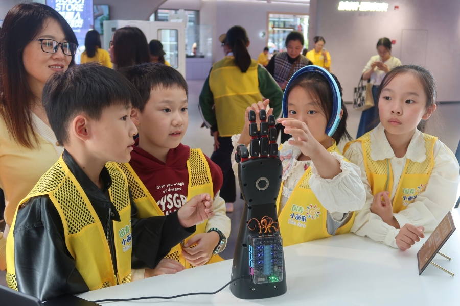 2025年10月25日,浙江省少年儿童书画艺术大赛获奖儿童走进杭州文三未来科技体验中心,亲身体验“艺术+科技”的跨界魅力。 中新社发 孙琳茹 摄