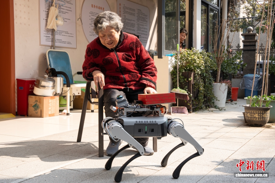 2025年2月24日,机器狗“小西”通过语音与老人互动。为进一步推进智慧化养老,杭州市西湖区古荡街道的金秋养老家园引入机器狗。中新社记者 吴君毅 摄