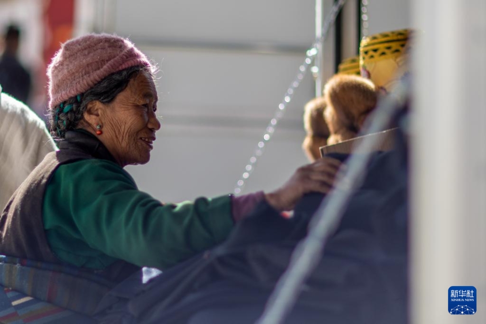 1月5日,在森嘎村村史馆前的广场上,老人晒着太阳吃着零食。新华社记者 姜帆 摄