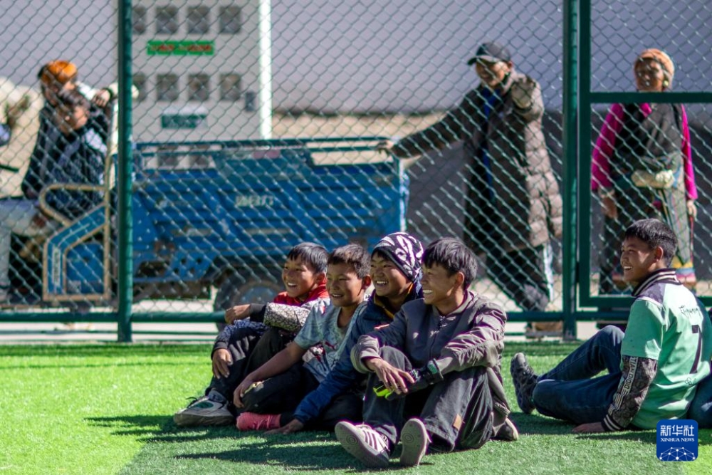 1月5日,在森嘎村的足球场上,少年在观看伙伴们踢球。新华社记者 姜帆 摄