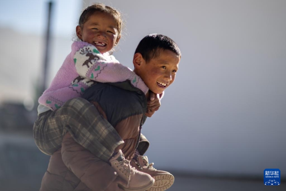 1月5日,在定日县长所乡森嘎村村史馆前的广场上,小朋友背着妹妹玩耍。新华社记者 姜帆 摄
