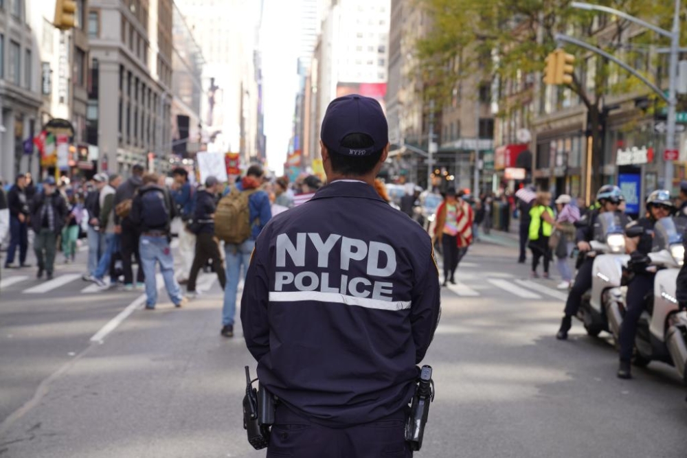 2025年10月18日,在美国纽约,警察在示威游行活动现场执勤。新华社记者 张凤国摄