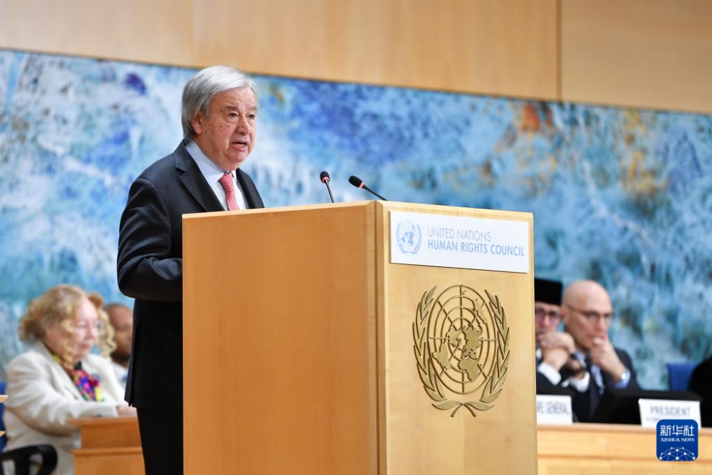 2月23日,在瑞士日内瓦万国宫,联合国秘书长古特雷斯在联合国人权理事会第61届会议上讲话。 新华社记者 连漪 摄