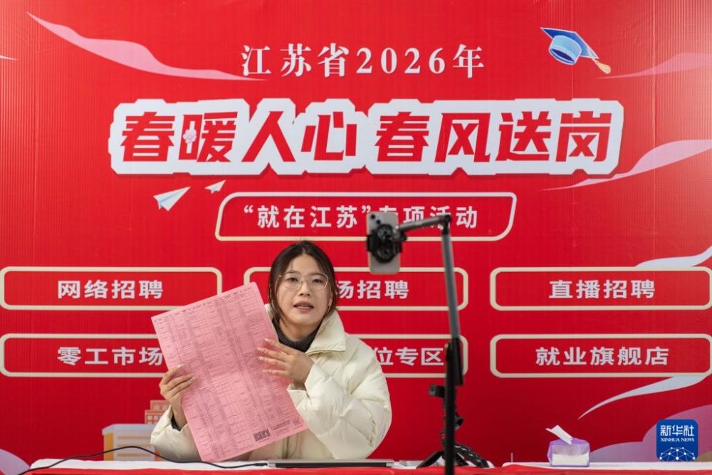 2月24日,在江苏省泰州市海陵区举办的2026年“春风送岗 就在海陵”专场招聘会上,工作人员利用直播平台推荐岗位信息。 新华社发(杨玉岗摄)