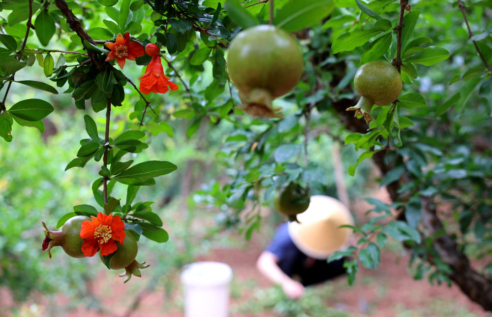 果农在山东枣庄峄城石榴园的石榴树下劳作(2025年6月18日摄)。新华社发(孙中喆 摄)