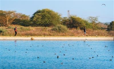 在肯尼亚内罗毕,中国企业为当地量身定制污水处理方案,中企修复扩建的内罗毕丹多拉污水处理厂成为多种鸟类的重要栖息地和公众环保教育的重要场所。图为当地居民经过丹多拉污水处理厂。新华社记者 谢剑飞摄